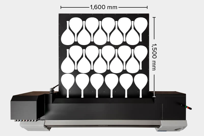Se han calculado basándose en la impresión de CMYK en 26 palas en una tabla. Se tardarían unos 48 minutos en imprimir 26 caras, lo cual se traduce en 1 hora y 36 minutos para imprimir 26 palas completas. Esto se consigue en tan solo 3 minutos y 41 segundos por pala.