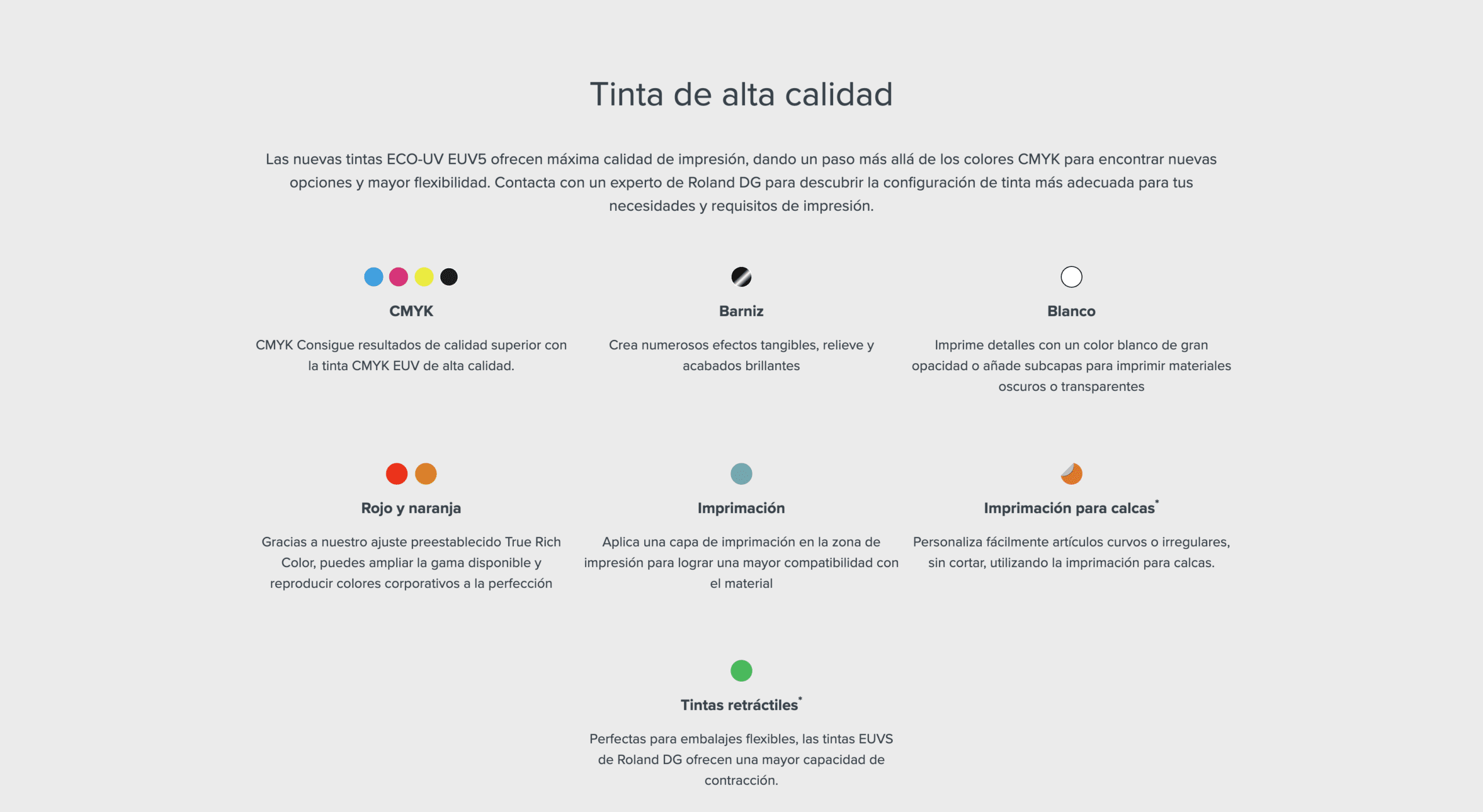 - Reproducción del color: Las tintas roja y naranja complementan la gama de colores. Las tintas EUV5 están disponibles en bolsas de 750 ml.