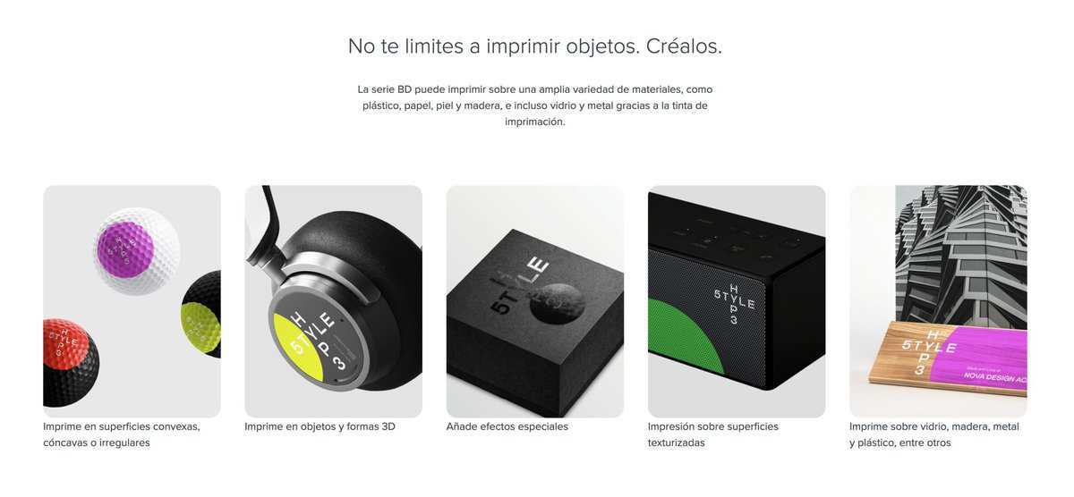 La BD-12 permite personalizar artículos con impresión UV plana, incluyendo objetos curvados, efectos de brillo y texturas 3D.